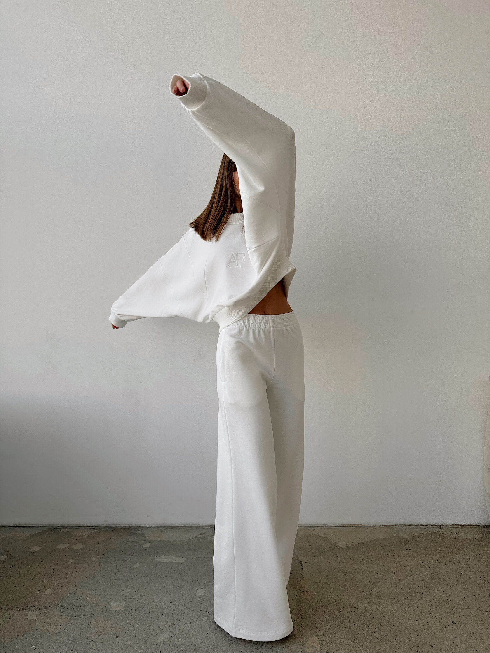 Универсальный комплект в белом цвете. Свитшот с логотипом AF и брюки клеш с карманами по бокам. Свободный крой и идеальная посадка подарит телу комфорт и позволит реализовать все свои планы. Подойдет для дома, прогулок, путешествий. В подарок к комплекту идет резиночка для волос, которая отлично дополнит образ.